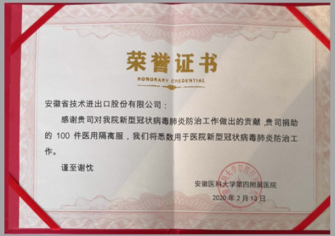 2月13日,安徽省技術(shù)進(jìn)出口股份有限公司籌集采購的100件醫(yī)用隔離服,順利捐贈安徽醫(yī)科大學(xué)第四附屬醫(yī)院,用于該院奮戰(zhàn)在新冠肺炎疫情防治一線的醫(yī)護(hù)人員。