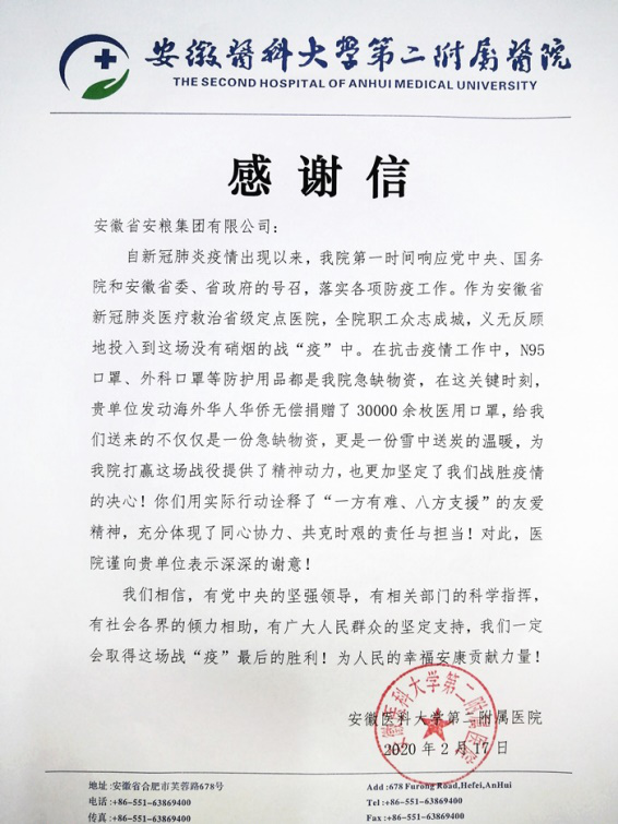 據(jù)悉,安糧集團聯(lián)合陳明祥先生另行籌集的3萬只醫(yī)用口罩,近日已定向捐贈安徽醫(yī)科大學(xué)第二附屬醫(yī)院。