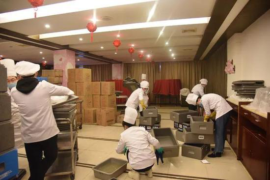 同時,遠(yuǎn)在400公里外的武漢,早上5點(diǎn),天尚未亮,艷陽天彭劉楊路店的后廚卻已是熱火朝天。廚師們正在為洪山體育館方艙醫(yī)院配餐。蒸雞蛋、蒸香腸、紅糖發(fā)糕、小肉包、花卷、新鮮水果,師傅們還特地制作了湯圓,寓意“早日團(tuán)圓”……為了讓大家吃得更貼心更舒服,每天的早餐都會配有干食和稀食。