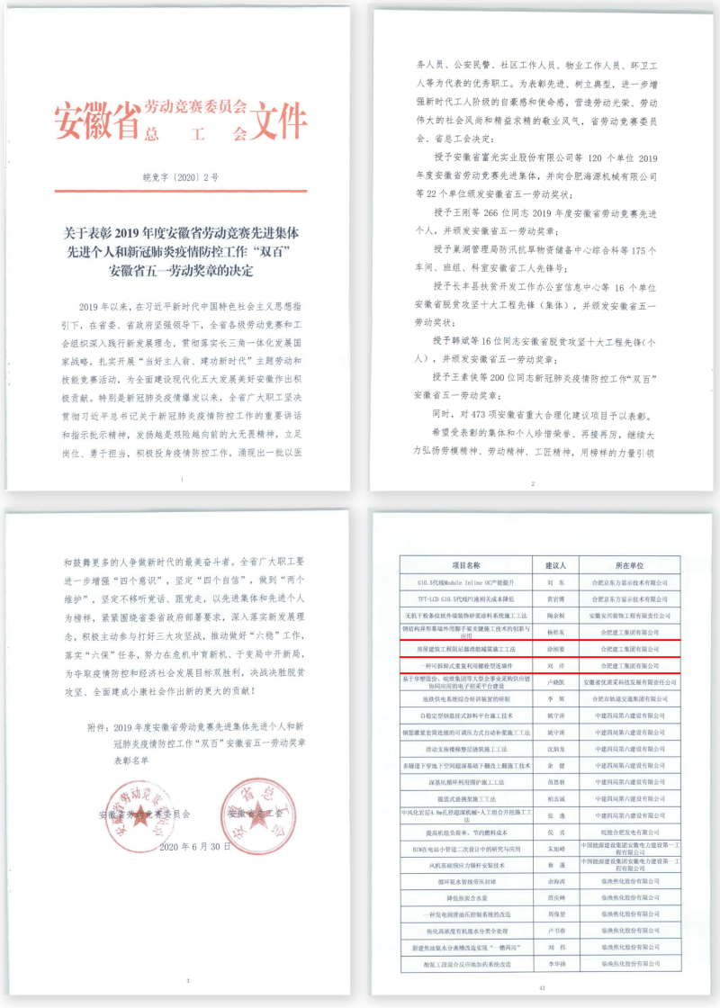 近日,由安徽省勞動(dòng)競(jìng)賽委員會(huì)、安徽省總工會(huì)組織評(píng)選的2019年安徽省重大合理化建議項(xiàng)目獎(jiǎng)揭曉,安徽國(guó)貿(mào)集團(tuán)所屬合肥建工公司首次申報(bào)的《鋼結(jié)構(gòu)異形幕墻外用腳手架關(guān)鍵施工技術(shù)的創(chuàng)新與應(yīng)用》(楊皓東)、《房屋建筑工程阻尼器消能減震施工工法》(涂剛要)和《一種可拆卸式重復(fù)利用螺栓型連墻件》(劉洋)均榜上有名。